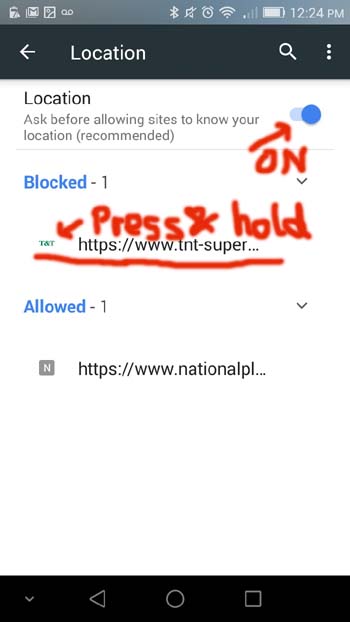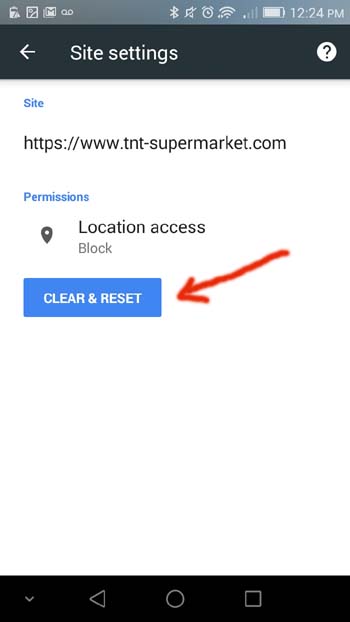 Menu -> Settings -> Site settings -> Location (Turn On) -> Hold and press blocked site name -> CLEAR & RESET